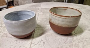 Après un petit café on s’installe chacun devant un tour et CC (le maître) nous invite à lui présenter ce qu’on sait déjà faire. Je m’exécute, je prends une motte de 600g, la place sur la girelle, monte et descend la terre et tourne un gobelet.