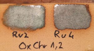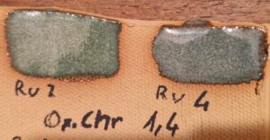 Ce choix, c’est l’oxyde de chrome. J’exclus l’oxyde de cuivre car il ne passe pas toujours les tests de laboratoire pour l’alimentaire. Pour le chrome, je sais qu’il passe les tests à la dose de 0,04% (voir test en laboratoire d’un émail rose).