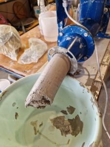 Je démonte le tout, nettoie, remonte et prends de la terre que j’utilise pour travailler, molle mais pas mouillée. Et là, oh bonheur, en poussant facilement le piston, un tube d’argile s’extrait majestueusement de l’orifice de l’appareil.
