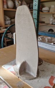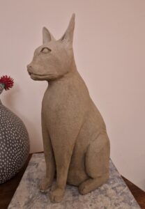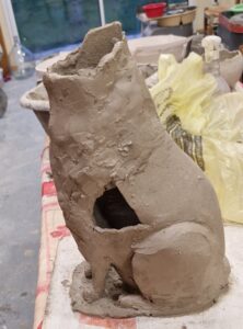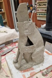 J’ajoute la tête, modelée de la même façon par des plaques d’argile collées les unes aux autres avec de la barbotine (même terre, très humide). De loin si je cligne les yeux, je devine que ça pourrait ressembler à un animal mais pas encore à un chat.