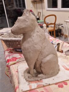 Prépare de petites plaques d’argile. Plaque-les au fur et à mesure sur le corps, retire de l’épaisseur là où il te paraît y en avoir trop. Tapote l’extérieur avec une palette en bois. Prends un peu de recul et compare ta statue à la photo de face et de profil. Quand ça commence à ressembler à ton modèle, tu cisèles le contour des yeux, de la gueule, fignole, jusqu’à ce que tu sois satisfait.