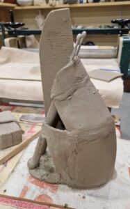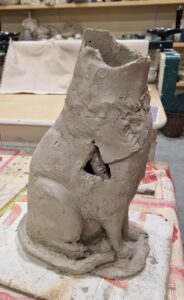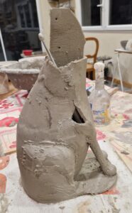 J’ajoute la tête, modelée de la même façon par des plaques d’argile collées les unes aux autres avec de la barbotine (même terre, très humide). De loin si je cligne les yeux, je devine que ça pourrait ressembler à un animal mais pas encore à un chat.
