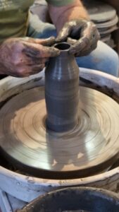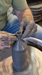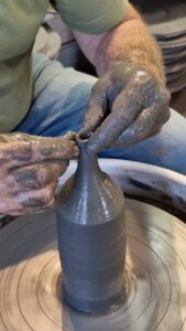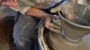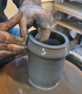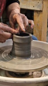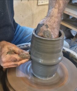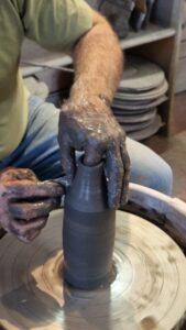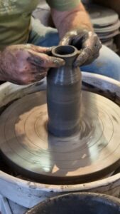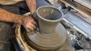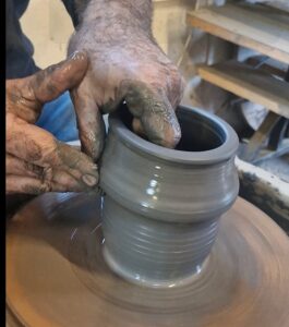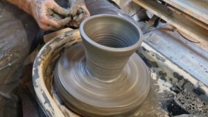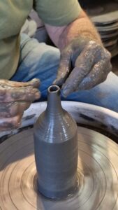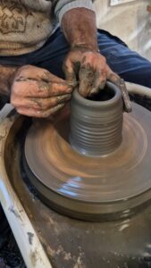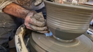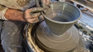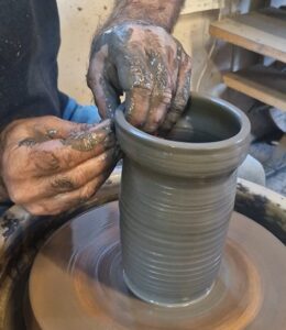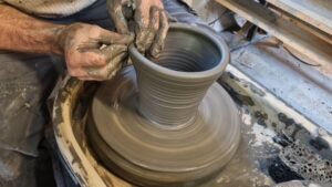 Regarde les deux mains: la gauche est positionnée verticalement comme dans le cylindre. La droite est presque à l’équerre et le corps de CC est penché à droite parce qu’il regarde la forme qu’il est en train de donner. C’est une sorte de gros pot-de-fleur, à paroi rectiligne. Régularise le bord. Recrée une gorge extérieure à la base.