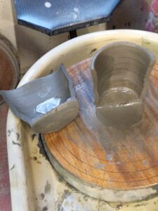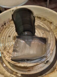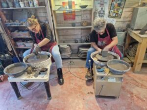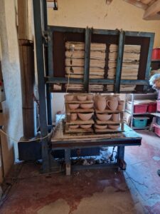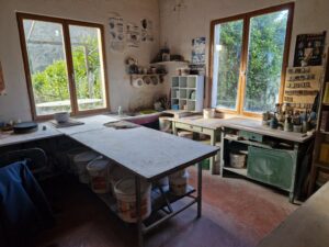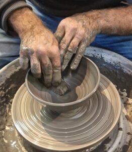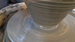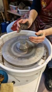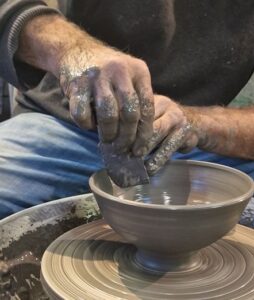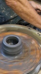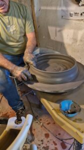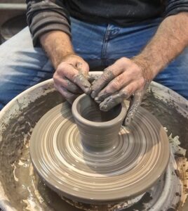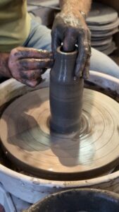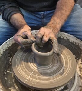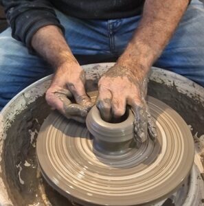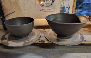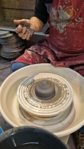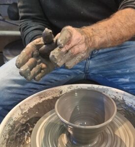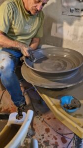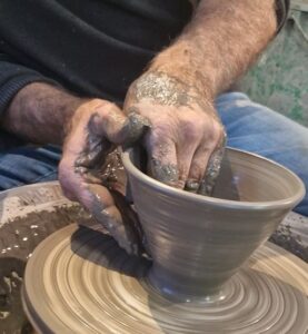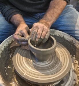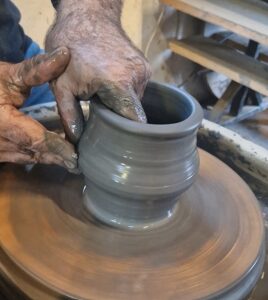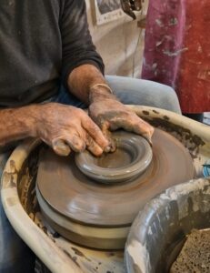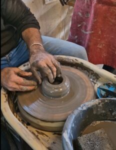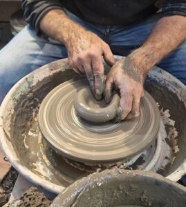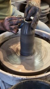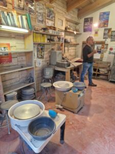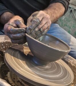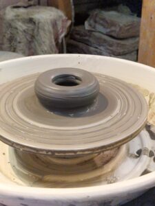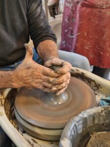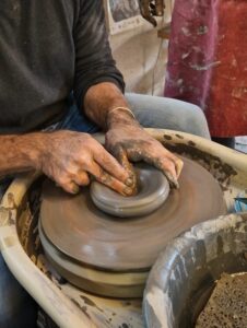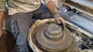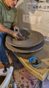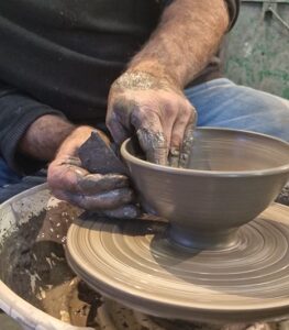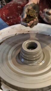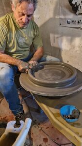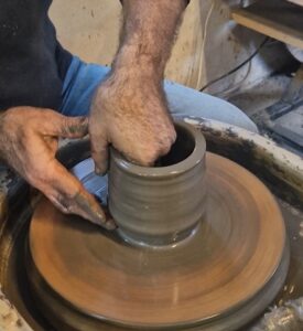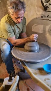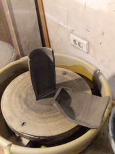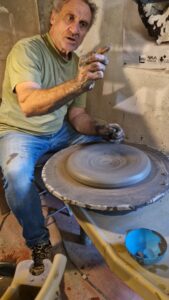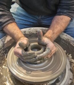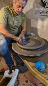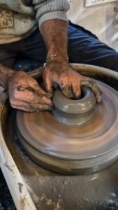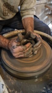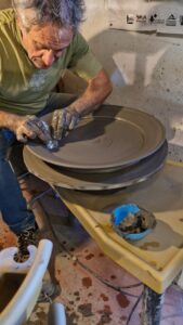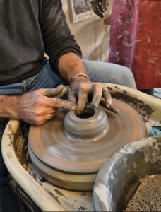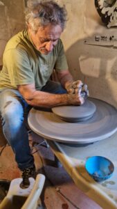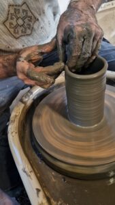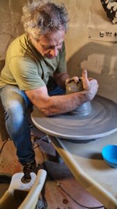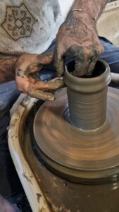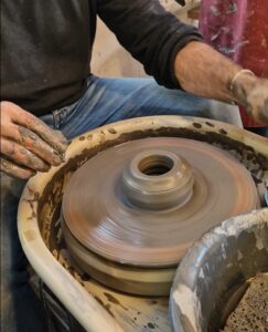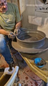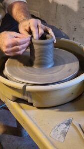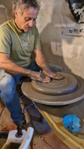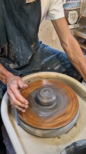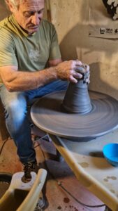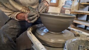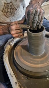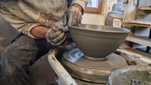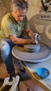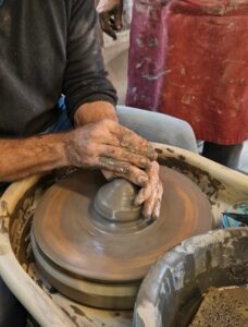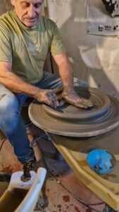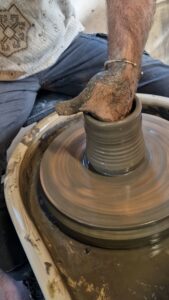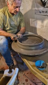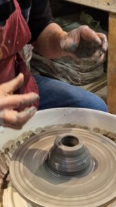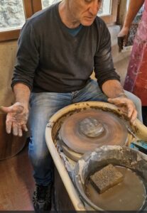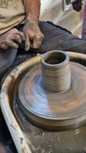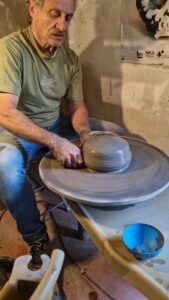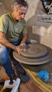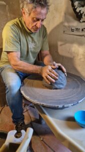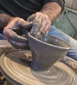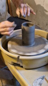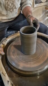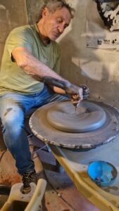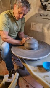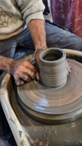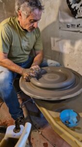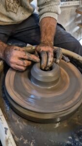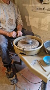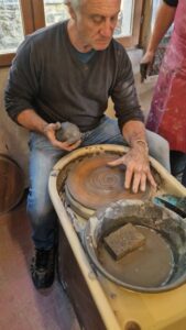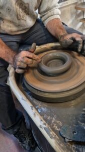 Après un petit café on s’installe chacun devant un tour et CC (le maître) nous invite à lui présenter ce qu’on sait déjà faire. Je m’exécute, je prends une motte de 600g, la place sur la girelle, monte et descend la terre et tourne un gobelet.