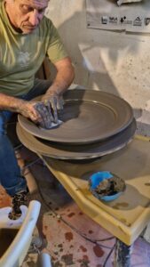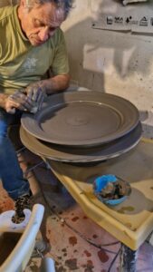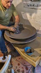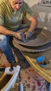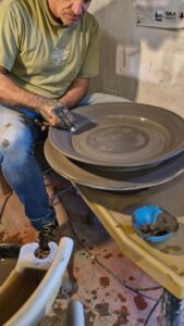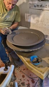 Il termine par le marli, c’est-à-dire la couronne qui ceinture le plat. L’estèque dans la main droite vient se placer en dedans et étire le marli en dehors. La main gauche à l’extérieur s’appuie sur la base du plat. Un coup d’estèque à nouveau sur le fond pour tirer la terre en dehors et la ramener en dedans. Cela renforce la cohésion du fond et évitera les fissures. Il termine par les finitions des jonctions entre le fond et le marli et enfin le bord supérieur.