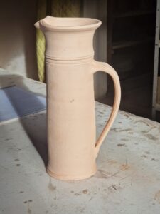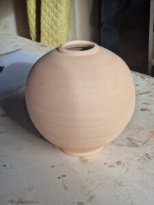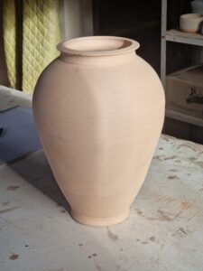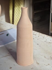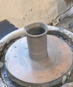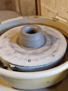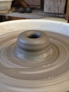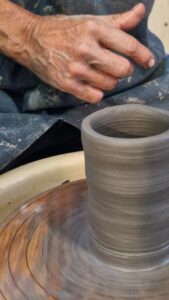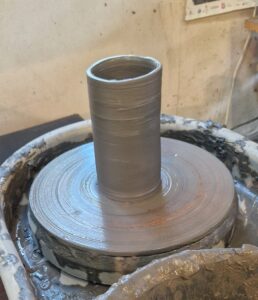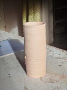 Ce cylindre doit faire 18cm de hauteur et 8cm de largeur en haut, plus étroit en haut qu’à la base. Le but est de bien monter la terre depuis le bas, avoir un fond de 5mm, une paroi régulière jusqu’en haut et un bord supérieur bien régulier.