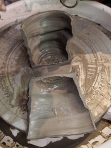 Un rondeau en contre-plaqué de 2cm d’épaisseur et 50cm de large, renforcé au dessous par un carré en bois vissé. CC place dessus une motte de 6Kg de grès GSA (grès de St Amand) chamotté avec chamotte fine de 0,05. Observe le centrage. Il faut une petite dépression sous le centre de la motte pour créer un effet ventouse. Il tape la motte pour la centrer au mieux avant de lancer la girelle. Regarde bien comme il se sert de ses mains et de ses avant-bras.