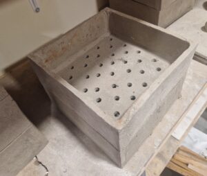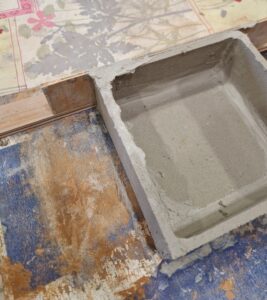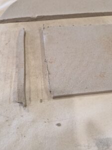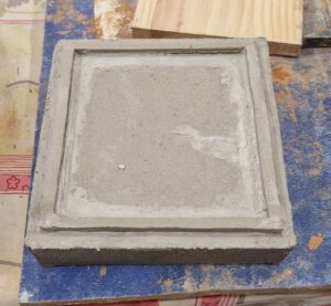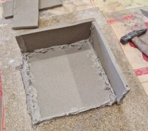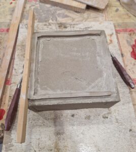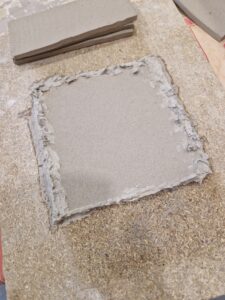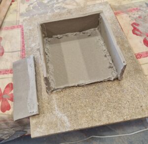 Découpe de fines bandes de terre de 15cm et 4x4mmColle les à la barbotine pour former un carré au dessous du fond.Laisse une marge de sécurité de 2mm entre le bord extérieur de ta cale et le bord intérieur de la boite.