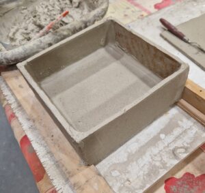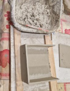 Enduis de barbotine le tour du fond et le côté.Dépose le bord vertical sur le côté du fond de boîte. Appliques une règle en bois contre le bas et tapote avec un petit marteau.Fais coller les bords entre-eux avec de la barbotine.Mets de la barbotine humide sur toutes les jointures que tu lisses avec le doigt.Place de petits colombins sur toutes les jointures que tu écrases et lisses au doigt.Une planchette de bois de 7cm de hauteur t’aide à découper le haut du bord avec le fil à découper. Ajoute de la terre s’il en manque.Passe ensuite aux autres boîtes et ainsi de suite…