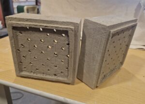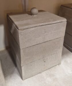 Empile maintenant boîtes et couvercle en ajustant les cales qui peuvent frotter les bords. Regarde si tes bords de boîtes sont bien alignés en verticalité. Ajuste en raclant avec l’estèque ce qui dépasse. Si le bord rentre un peu, tapote le vers l’extérieur après l’avoir humecté.