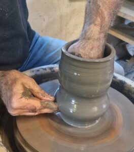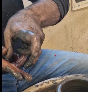 La pince a monté la terre vers l’extérieur pour former une sorte de petit pot-de- fleur. Régularise le bord. Recrée une gorge extérieure à la base et mets tes doigts en position comme pour la vague du cylindre. Ici, pas de vague mais un « duo de majeurs ». Les deux majeurs vont travailler ensemble en regard l’un de l’autre.